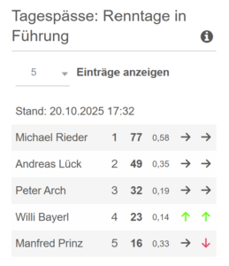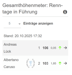 Bei den Höhenmetern ist dies die Führungstage in Gesamthöhenmetern. Hier läuft ein Kopf-an-Kopf-Rennen zwischen Andreas und Albertano, das wahrscheinlich in einem Fotofinish endet.