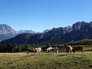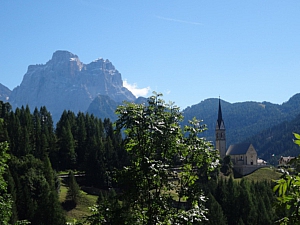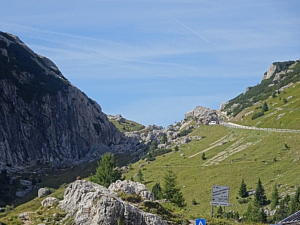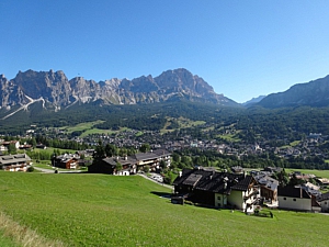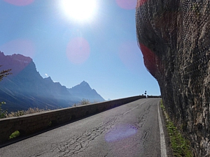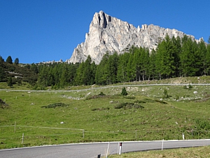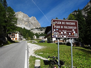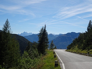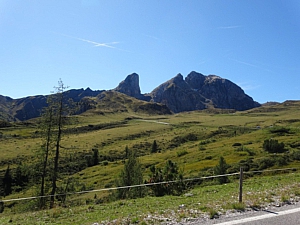 Fünf Grad Celsius meldete das Autothermometer, als wir, nach einem reichhaltigen Frühstück, nach Cortina d’Ampezzo düsten. Als wir in Cortina losradelten hatte es aber wohlige 14 Grad und strahlend blauen Himmel. Die ersten fünf Kilometer bis nach Pocol (hier zweigt die Straße ab zum Passo Giau waren gut zum Einfahren und öffneten tolle Blicke nach Süden. Der Touristenverkehr war nicht unerheblich und nervte zeitweise, da vor allem die Motorräder die spätsommerliche Ruhe störten.