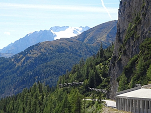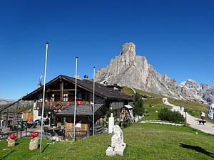 Der Anstieg ist nicht schwierig aber die mehr als 1000 Höhenmeter von Cortina sind auch erstmal zu überwinden. Ist man in dem oberen Abschnitt, so hat man einen herrlichen Rundumblick auf die Dolomiten. Auf der Passhöhe angekommen konnte ich den Irrsinn hautnah erleben. Ich setzte mich gemütlich auf einen Stein und beobachte, wie ein Reisebus 40 Chinesen ausspuckte, die überall umhersprangen und schnell ein paar Selfies schossen. Auch waren zahlreiche Motorradfahrer angekommen (die mussten entweder schon seit längerem hier sein oder von Süden heraufgekommen sein, denn mich überholten bei der Auffahrt nur 9), die mit E-Zigarette vor dem Passschild posierten. Dann waren auch noch zahlreiche Wanderer, Geldsammler für Drogensüchtige (Antidrogenprogramm) und Campingmobile zugegen. Nur auf der urigen Hütte „Passo di Giau“ saß fast niemand. Wir auch nicht, da es noch zu früh war. Die Abfahrt mit ihren 29 Kehren ist zwar schön zu fahren, aber man hat in dieser waldigen Gegend kaum einen Blick.