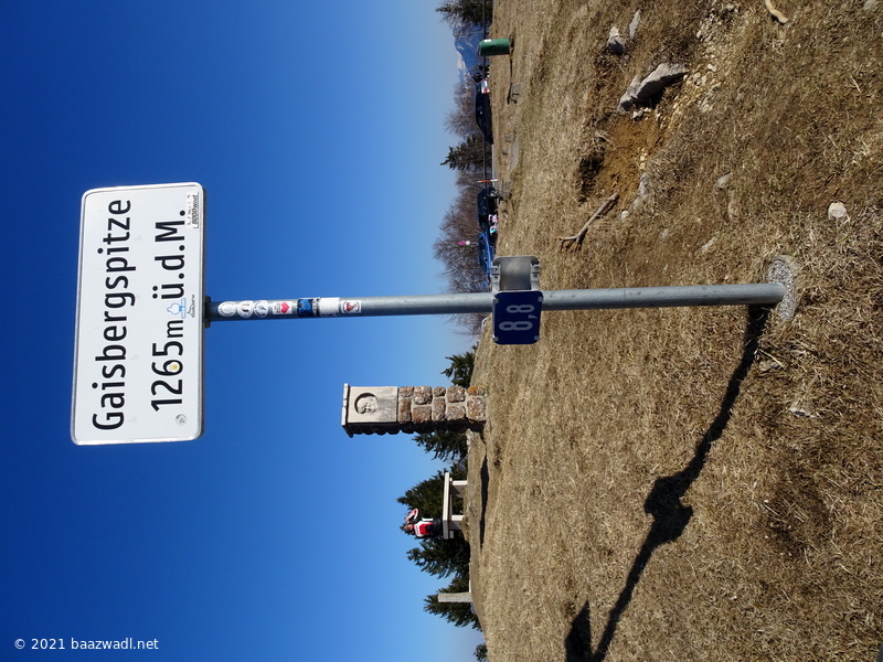 Nach einigen km geht’s links ab auf ruhiger, schmaler Straße nach Oberwinkl. Irgendwann rückt dann auch der Sendemast am Gipfel des Gaisbergs ins Blickfeld und lässt ahnen, dass noch einige Höhenmeter vor einem liegen. Schließlich trifft man auf die von Guggenberg heraufziehende Gaisberghöhenstraße(die anfangs erwähnte Rennstrecke). Auf 1000m Höhe passiert man die Zistlalm. Die Steigung zieht jetzt an. Auf den knapp 300 Höhenmetern zum Gipfel gibt es nur noch eine einzige Linkskehre, sonst geht’s immer stur geradeaus.